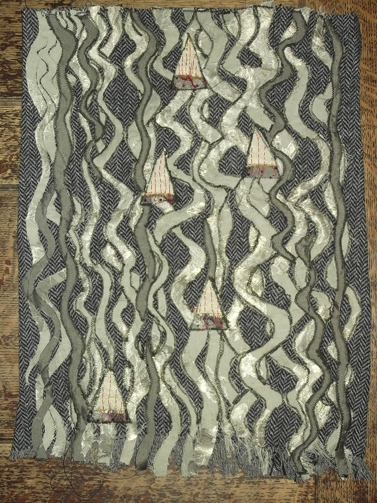I think this sample has been successful in that it conveys what I wanted it to convey. I could have made stronger dark/light contrasts. And I could do it using different shades of one colour in future. Or in fact, using fabric to reperesent the negative spaces between the wavy lines perhaps?